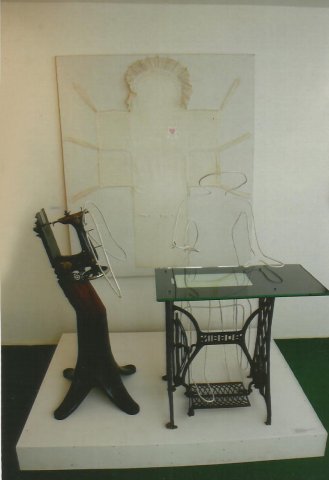 Fém, fa,üveg 125 x 140 x 91 cm Háttérben:Szemadám György „Lélek szkafander” c. műve